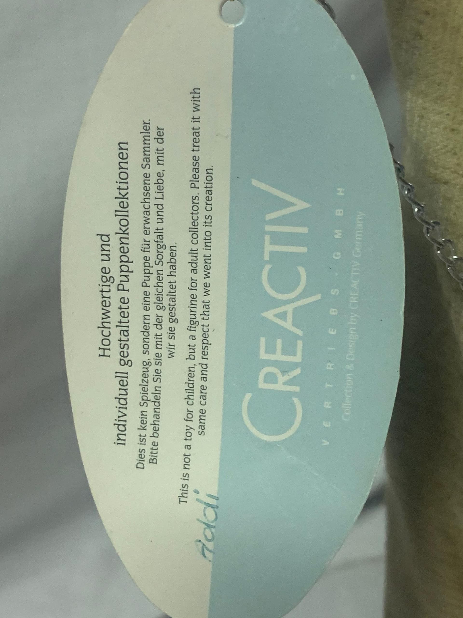 ''Bambola da collezione di alta qualità e progettate individualmente. questo non è un giocattolo , ma una bambola per collezionisti adulti. per favore trattali con la stessa cura e amore che hai li abbiamo progettati '' creactiv VERTRIEBS GMBH COLLEZIONE E DESIGN DI CREACTIV GERMANY